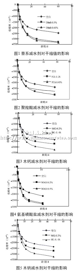 2.2 相同水灰比條件下,不同減水劑品種在相同摻量下對收縮性能的影響