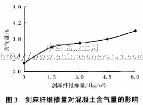 由圖3 可知,隨著劍麻纖維摻量增加,劍麻纖維混凝土的含氣量有所增大,所以劍麻纖維混凝土的密度比普通水泥混凝土略有下降,但影響不顯著。