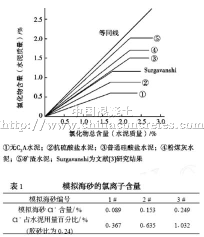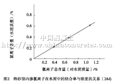 (1) 在氯離子總含量不是很高的情況下,海砂型內摻氯離子存在一個固定的結合率,這個結合率低于普通型內摻氯離子的結合率。