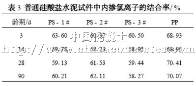 試驗測試并計算了海砂型內摻Cl - 的普通硅酸鹽水泥試件在不同氯鹽引入量和不同齡期的氯離子結合率,為了與普通內摻型做對比,測試了與PS - 3 # 相同氯鹽引入量的PP試件的氯離子結合率,測試結果見表3。