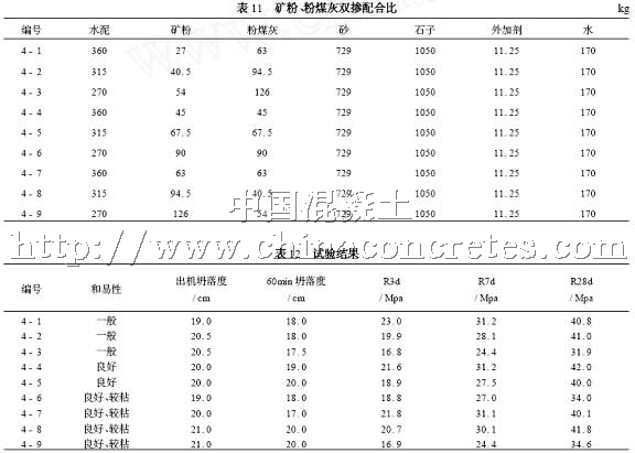 (2) 單摻粉煤灰,混凝土的早、中期強度增長較慢,單摻礦渣微粉,混凝土泌水現象增大,黏度提高,不利于混凝土泵送施工。