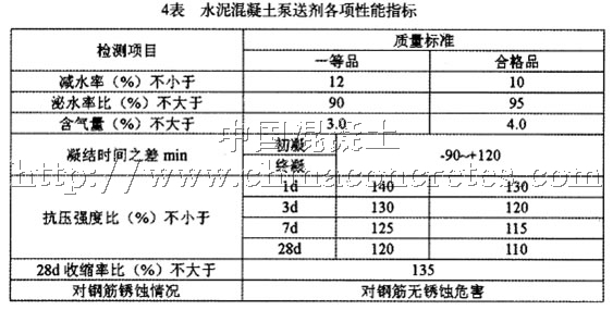 泵送劑首要的是應(yīng)具備良好的可泵性,所謂可泵性,就是水泥混凝土拌和物具有順利通過輸送管道、不堵塞、不離析、粘聚性良好的性能。泵送劑必須在較長的時(shí)間內(nèi)保持混凝土拌和物具有較高的坍落度,具備足夠的緩凝時(shí)間,優(yōu)良的粘聚性和抗離析性,以利于泵送混凝土的順暢施工。其各項(xiàng)性能指標(biāo)符合4表要求。