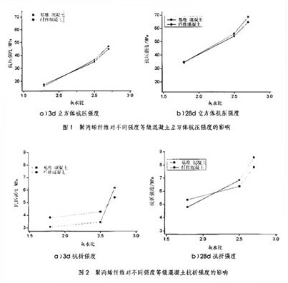 由試驗可知,對于較低強度等級的混凝土,摻聚丙烯纖維后能夠提高混凝土的立方體抗壓強度和抗折強度:對于中等強度的混凝土,摻聚丙烯纖維后能夠提高混凝土的抗折強度,但會稍微降低混凝土的立方體抗壓強度:對于高強混凝土,摻聚丙烯纖維后,混凝土的立方體抗壓強度和抗折強度均會降低。