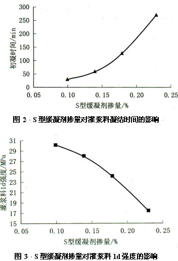 綜合考慮,本文采用 S 型緩凝劑調整灌漿料的凝結時間。該緩凝劑的摻量對灌漿料凝結時間及 1d 強度的影響見圖 2 、圖 3 。