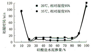 圖 1 硅酸鹽和鋁酸鹽水泥混合體的初凝時間 實驗表明,硅酸鹽水泥和鋁酸鹽水泥直接混合使用時,會在很大的混合比例區間內,凝結迅速,而無法正常使用。其原因在于:—方面,鋁酸鹽水泥在溫度低于 30 ℃ 時,水化生成的 CAH 10 和 C 2 AH 8 屬于亞穩晶系,會快速與硅酸鹽水泥生成的 Ca(OH) 2 發生反應,生成屬于穩定晶系、強度很低的 C 3 AH 6 晶體,加速凝結。同時生成的 C 3 AH 6 在水溶液中會與硅酸鹽水泥中起緩凝作用的石膏反應生成鈣礬石,石膏的消耗導致硅酸鹽水泥中的 C 3 A 水化反應迅速進行,從而加速了體系的凝結硬化;另一方面,當反應溫度在 30 ℃ 以上時,鋁酸鹽水泥的水化產物為 C 3 AH 6 會迅速消耗硅酸鹽水泥中的石膏,加速硅酸鹽水泥的水化,造成凝結時間過快。因此,需要添加合適的緩凝劑,延長灌漿料的凝結時間。本文通過實驗研究了不同的緩凝劑對灌漿料的凝結時間、流動性能和強度的影響,結果見表 3 。 表 3 緩凝劑對凝結時間及其它性能的影響