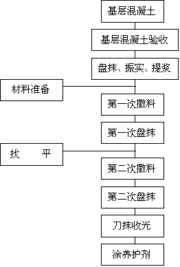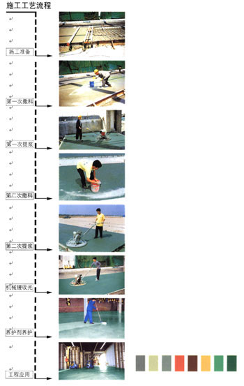 第一次撒料:將規(guī)定用量 2/3 的耐磨材料均勻撒布在剛初凝的混凝土表面。 第一次提漿:街耐磨材料吸收一定水分后,利用機(jī)械進(jìn)行提漿作業(yè),并用刮尺找平。 第二次撒料:待耐磨材料硬化情況至一定階段,再將規(guī)定量的 1/3 材料進(jìn)行第二次撒布作業(yè),并用機(jī)械提漿。 機(jī)械鏝刀收光:根據(jù)地坪的硬化情況,利用機(jī)械鏝刀收光作業(yè)。 養(yǎng)護(hù):地坪收光完畢,進(jìn)行薄膜養(yǎng)護(hù)或推薦專用養(yǎng)護(hù)劑養(yǎng)護(hù)。 應(yīng)用:根據(jù)天氣情況,在使用前推薦專業(yè)清潔打蠟,具有明顯裝飾效果。