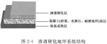 二、滲透硬化地坪設(shè)計(jì) (1) 滲透增強(qiáng)型防塵硬化地坪是一種繼骨料耐磨地坪和樹(shù)脂涂層地坪之后的新型地坪產(chǎn)品,針對(duì)現(xiàn)有工業(yè)與民用建筑地坪做法有很強(qiáng)的互補(bǔ)性,納米級(jí)增強(qiáng)材料滲透至混凝土內(nèi)部,形成如石材般的高強(qiáng)結(jié)晶體,有效提抗磨性,延長(zhǎng)地面使用壽命,徹底解決混凝土地面起砂、揚(yáng)塵、疏松、風(fēng)化等問(wèn)題,使地面具有無(wú)塵、耐磨、抗?jié)B、防腐、易清潔的特點(diǎn)。其系統(tǒng)結(jié)構(gòu)見(jiàn)圖 2 — 4 (3) 適用場(chǎng)所: (4) 技術(shù)參數(shù)