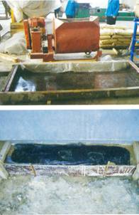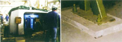 邯鄲鋼鐵廠一軋重級工作制天車結構為 A 、 B 兩列排柱,軌道總長 288m 。標高為 14. 800m ,跨度 18.5m 。大修要求將煉鋼車間橋式軌道更換為新軌道,原舊軌用壓板焊接在 [16 短槽鋼上,槽鋼焊在鋼板上,鋼板用螺栓與混凝土吊車梁連為一體。大修時需全部拆除舊軌道槽鋼、螺栓,換新軌道及螺栓。考慮到工期緊,采用 CGM 漿料填充軌道墊板與支座之間的空隙(右圖 ) 。