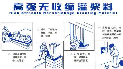 是一種以水泥為膠結材、配以復合外加劑和特制骨料,現場加水攪拌后即可使用,具有無收縮、大流動性、高強特性的專用灌漿料,不含氯離子。 Non-shrink grout material is based on Portland cement mixed with compound admixture and graded aggregate. It is character ized of non-shrink, high flow ability and high strength.