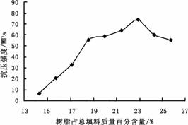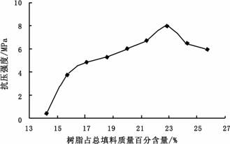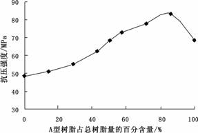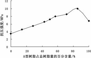 圖 3 A 型與 B 型樹脂配比對混凝土抗壓強(qiáng)度的影響 由圖 2 、圖 3 可見,只用 B 型樹脂制備的混凝土的強(qiáng)度要比只用 A 型樹脂制備的混凝土高,隨著 A 型樹脂含量的增大,強(qiáng)度也隨之增大,當(dāng)增至 85% 左右時(shí)達(dá)到最大值,然后再減小。 A 型和 B 型樹脂混合使用,當(dāng) A 型樹脂含量在大于 50% 時(shí),其強(qiáng)度高于只用 A 型樹脂或 B 型樹脂制備的聚合物混凝土。 A 型和 B 型樹脂均屬于不飽和聚脂樹脂,他們具備相似結(jié)構(gòu),所以相容性很好,混合后制得的聚合物混凝土綜合兩種樹脂的優(yōu)點(diǎn),避免了單一樹脂在某一方面的缺陷。 3 、樹脂用量對混凝土性能的影響 由于樹脂用量過小會(huì)導(dǎo)致聚合物混凝土不能凝聚成型,過多會(huì)導(dǎo)致成本過高,因此根據(jù)實(shí)際情況選取了一定的范圍,如圖 4 、圖 5 所示。