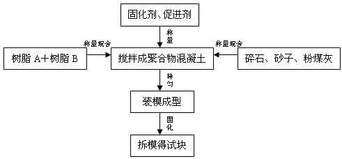 高速公路、立交橋、高架橋均以車流量大、速度快為特點(diǎn)。由于車速快,路面稍有缺陷,就易造成交通事故。傳統(tǒng)的修補(bǔ)材料新老路面親合力差、凝固慢,施工時(shí)不得不將待維修路面封閉,鏟除足夠大的舊路面,進(jìn)行施工。針對高速公路、立交橋、高架橋的修補(bǔ),我們研制了一種高強(qiáng)、速凝、粘結(jié)強(qiáng)度高的聚合物混凝土修補(bǔ)材料。 圖 1 聚合物混凝土的制備工藝簡圖 3 、粘結(jié)強(qiáng)度測試 將 40 × 40 × 160 ㎜的砂漿斷塊與聚合物混凝土對接,得到與原試塊規(guī)格相同的試塊。待其固化后,測試該試塊的抗折強(qiáng)度,以此作為粘結(jié)強(qiáng)度的指標(biāo),并觀察新斷面的情況。 4 、耐老化試驗(yàn) 將試塊放入人工老化箱中進(jìn)行老化試驗(yàn)。老化條件: 6kW 氙燈,溫度 35 ℃ ,相對濕度 70% 以上。降雨周期及時(shí)間: 6min/h ,降雨壓力: 8 ~ 10N/cm 2 。 四、結(jié)果與討論 1 、原料的配比 根據(jù)多組實(shí)驗(yàn),篩選出各原料的配比如下:樹脂 70g ,固化劑 3g ,促進(jìn)劑 3.5g ,碎石 350g ,砂子 220g ,粉煤灰 80g 。 2 、 A 型與 B 型樹脂配比對混凝土性能的影響