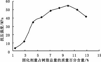 4 、固化劑用量對混凝土性能的影響 圖 6 固化劑用量對混凝土抗折強(qiáng)度的影響 由圖 6 、圖 7 可見,固化劑的加入一定要適量,隨著固化劑加入量增加,混凝土的強(qiáng)度先增加,當(dāng)加入過多固化劑卻適得其反,混凝土強(qiáng)度反而降低了。因此,固化劑的加入量要適中,在 4% ~ 11% 較適宜。固化劑加入量過少,混凝土不能完全固化;加入量過大,形成小分子量的聚合物,其脆性大,因而強(qiáng)度降低。 |