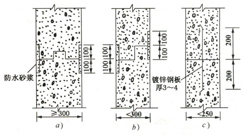 施工縫是防水工程的薄弱環節之一,最好不留或少留。但在混凝土澆筑受設備或支模條件限制不能連續施工時,可允許在預定部位留設施工縫。施工縫不能留在剪力與彎矩最大處,或底板與側壁交接處,而留在底板以上 20 cm 處的墻身上。