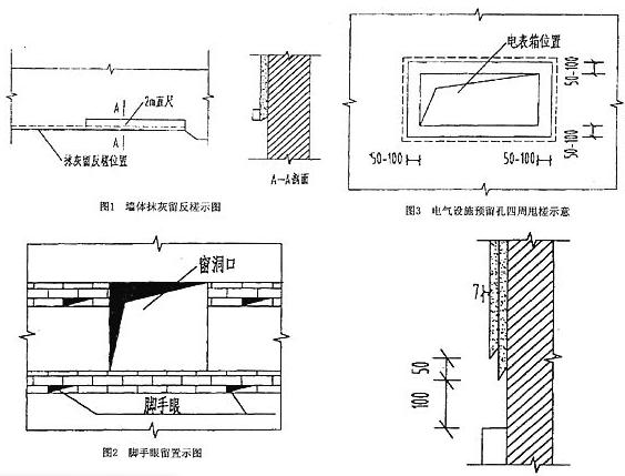 (3)外腳手架穿墻的鐵排木或卸載的鋼絲繩凸出內墻面且影響抹灰時,需要在管端或鋼絲繩兩側100mm范圍內留反槎。