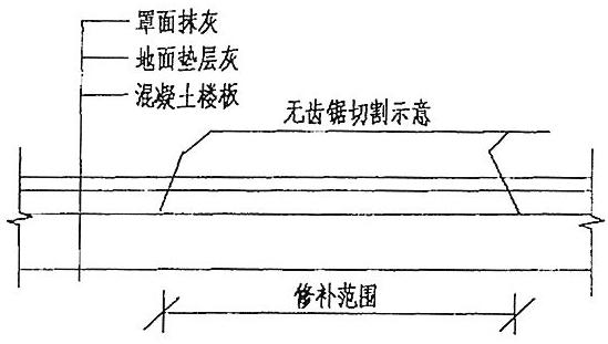(二)抹灰層空鼓或裂縫需要修補時,可用粉筆劃出其位置,用無齒鋸沿粉筆印割縫,鋸身應向修補范圍傾斜(圖5)。剔鑿創口內硬結砂漿時,可用人工手持鋼釬、手錘適力作業,沖鑿力不能過大,以免振動擴大墻(地)面的空鼓范圍。