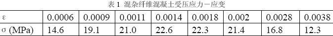 為了驗(yàn)證上述分析的正確性,筆者采用一組150mm×150mm×150mm的鋼/聚丙烯混雜纖維立方體試件作為分析實(shí)例。其中,鋼纖維體積率f ρ =1.5%,聚丙烯纖維參量f =0.9kg/m V 3。試驗(yàn)采用單軸壓縮,試驗(yàn)所得的混雜纖維混凝土受壓應(yīng)力-應(yīng)變關(guān)系如表1所示。