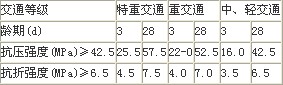 特重、重交通路面宜采用旋窯生產的道路硅酸鹽水泥,也可采用旋窯生產的硅酸鹽水泥或普通硅酸鹽水泥;中、輕交通的路面可采用礦渣硅酸鹽水泥;低溫天氣施工或有快通要求的路段可采用R型水泥,此外宜采用普通型水泥。《公路水泥混凝土路面施工技術規范》(JTG F30-2003)中規定各交通等級路面水泥抗折強度、抗壓強度應符合表2的規定。