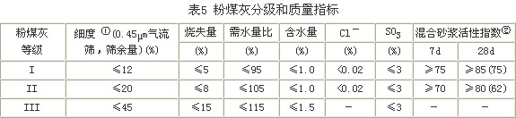 混凝土路面在使用粉煤灰作為摻合料時,根據相關規定,應摻用質量指標符合表5規定的電收塵I、II級干排或磨細粉煤灰,不得使用III級粉煤灰。貧混凝土、碾壓混凝土基層或復合式路面下面層應摻用符合表5規定的III級或III級以上粉煤灰,不得使用等級外粉煤灰【1】。對用作為水泥混合材的粉煤灰,雖然與作為混凝土摻合料的要求并不完全相同,但表5的要求也可作為參考。