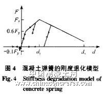由于在地震作用下,材料受到的是反復荷載,存在一個彈簧剛度退化過程.鋼筋可取理想彈塑性模型、混凝土的退化模型如圖4所示.圖4中符號以受壓為正,在-0.1Fy<F<0.6Fy時按彈性加卸載、當F>0.6Fy時,彈簧進入非線性階段,曲線指向屈服點(dy、Fy),屈服位移dy根據混由土的屈服應變確定,取0.002倍彈簧長度,卸載時沿與初始剛度平行的斜率卸載,到達水平軸后,再指向原點,再加載時,沿原路返回;當F=Fy時,進入下降段,下降段指向極限變形點(du,0.2Fy),du為溫凝土的極限變形,在下降段的加卸載法則同非線性上升段,鋼筋彈簧可根據鋼種取極限應變0.016~0.025,混凝土彈簧的極限應變取0.0033,當彈簧的應變超過上述值時,認為彈簧已破壞。