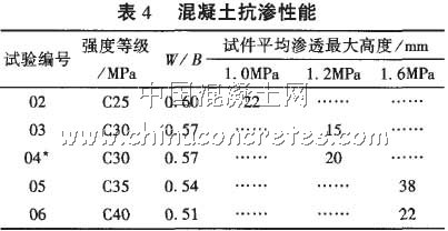 由于商品混凝土經常有抗滲性能要求,我們還對表3中部份石屑混凝土的抗滲性能作了測試,結果見表4。