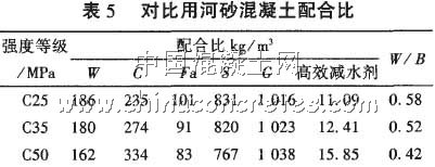 表5中河砂混凝土采用的河砂為I區中砂,細度模數2.8,減水劑為蔡系高效減水劑,含固量為20%。從對比用的河砂混凝土配合比看,相同強度等級河砂混凝土的W/ B較石屑混凝土的W/ B略小,這意味著相同W/ B時,石屑混凝土的強度較河砂混凝土強度略高。初步分析有兩個原因:一是石屑的表面往往較粗糙,并帶有棱角,使石屑與漿體的機械咬合力增強;二是由于石屑的吸水率較河砂大,使得混凝土內有效W/B降低,特別是降低了石屑與漿體結合界面的W/B,改善了界面結構。相對而言,后一種因素起了決定性作用。