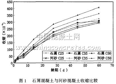 從圖1可 以看出,相同環境條件下同強度等級的石屑混凝土收縮比河砂混凝土要大一些,這可能是同強度等級石屑混凝土單方用水量要比河砂混凝土大,其中部份水是被石屑吸收,這部份水的蒸發會增大混凝土收縮;另外一個原因可能是石屑中細顆粒的堅固性較河砂差,從而影響了混凝土收縮。總體看來中低強度等級的石屑混凝土收縮較同強度等級的河砂混凝土增加不是很明顯,而石屑C50混凝土收縮較中低強度等級的混凝土明顯偏高,所以在配制較高強度等級石屑混凝土時應進一步研究改善收縮性能的方法和措施。