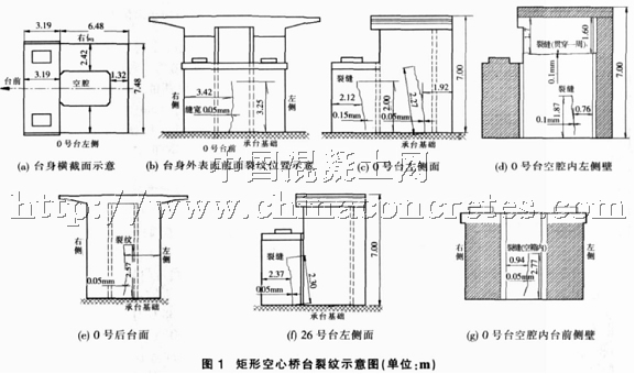 均采用竹膠模板、木框架和鋼腳手支架, 一次拼裝成型, 分別于2006年10月6日~2007年2月8日完成施工。設(shè)計(jì)考慮了混凝土抗侵蝕, 使用江蘇雙猴牌礦渣P.O42.5水泥, 施工配合比摻加粉煤灰, 摻加防腐劑3.8 % , 采用泵送澆注。東大溪橋3號(hào)臺(tái)身分兩次灌注, 其余均一次灌注成型。4座橋臺(tái)施工期間均是當(dāng)?shù)氐蜏丶竟?jié), 氣溫為13~28℃。混凝土入模溫度最高27℃, 入模前實(shí)測(cè)坍落度為130~160 mm。混凝土澆筑后均采用表層覆蓋灑水養(yǎng)護(hù), 模板外部未包裹, 帶模養(yǎng)生不少于14天。裂紋均在拆模后3~7天發(fā)現(xiàn), 大多為豎向裂紋, 空腔內(nèi)有兩道水平縫, 位置分別位于橋臺(tái)外表面和空腔內(nèi)墻壁, 寬0.05 ~0.15mm, 探測(cè)深度在保護(hù)層范圍內(nèi)。發(fā)現(xiàn)裂紋后即對(duì)部分裂紋采取抹水泥條和貼片觀察, 未見發(fā)展。秋蘆溪特大橋臺(tái)身裂紋示意見圖1。