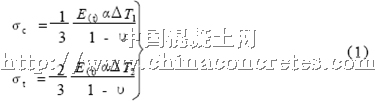 式中 σt , σc 分別為混凝土的拉應(yīng)力和壓應(yīng)力,N /mm2 ; E ( t) 為混凝土的彈性模量, N /mm2 ; α為混凝土的熱膨脹系數(shù), 1 /℃; △T1 為混凝土截面中心與表面之間的溫差, ℃; ν為混凝土的泊松比, 取0.15~0.20。