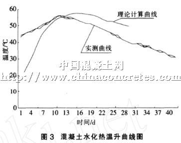 該橋拆模后環(huán)境溫度平均按20℃、拆模齡期按20天考慮, 理論計(jì)算的結(jié)構(gòu)內(nèi)部最高溫度為58℃。實(shí)際監(jiān)控的結(jié)構(gòu)內(nèi)部最高溫度為56℃。裂紋發(fā)生在澆筑15天以后, 根據(jù)理論計(jì)算曲線和實(shí)測(cè)記錄結(jié)果,結(jié)構(gòu)核心最高溫度按45℃驗(yàn)算, 混凝土水化熱溫升曲線見圖3。從圖3可以看出, 在水化熱高峰期過(guò)后,實(shí)測(cè)溫度曲線比理論計(jì)算下降快, 說(shuō)明臺(tái)身裸露后散熱速度加快。