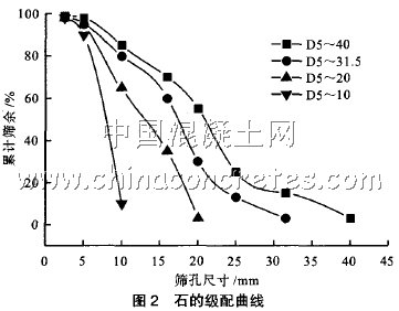 混凝土的抗壓強度不僅取決于其水膠比,還取決于其粗集料的級配。對高水膠比的混凝土而言,宜采用較大粒徑的粗集料,以減小粗集料的總表面積;而對低水膠比的}昆凝土而言,宜采用較小粒徑的粗集料,以減小粗集料周圍尤其是底部的泌水趨勢,從而提高過渡區的品質j并提高混凝土的強度。