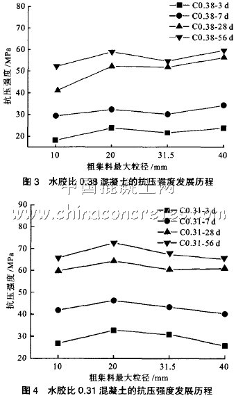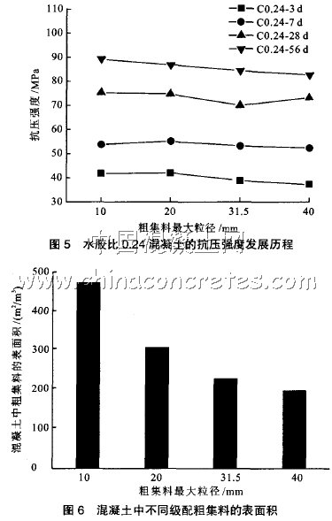 在本試驗研究的水膠比范圍內,對水膠比為O.38的混凝土,宜采用最大粒徑為40 min的粗集料;對水膠比為0.31的混凝土,宜采用最大粒徑為20 mlTl的粗集料;對水膠比為0.24的混凝土,宜采用最大粒徑為lo mm的粗集料,以使得混凝土獲得較高的強度。