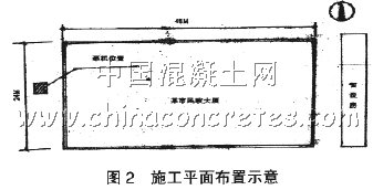 (1) 建設單位應注意問題。在通常情況下, 建設單位( 或開發商) 在一項工程未開工前就已進入現場, 由于諸多因素沒有確定, 特別是對施工平面圖不十分重視, 不夠了解其內容, 在現場平面圖布置中的隨意性給工程施工帶來諸多麻煩, 甚者造成工期的拖延, 易出質量事故, 這樣的實例很多。例如: 在48 m×24 m 厚1.8 m 的基礎筏板混凝土澆筑施工中平面布置沒有考慮到從48 m 兩側供料, 只能從一側采用地泵澆筑, 另一側已建了兩層的簡易房和辦公室, 這樣就使進度拖后了近15 d, 帶來了諸多不應有的損失, 僅降水一項就多花了20~30 萬元, 具體布置見圖2。