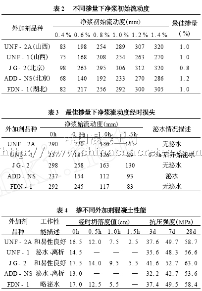 (2) 外加劑選擇:通過對不同廠家生產的產品對比,選擇與水泥適應性良好的產品。主要對比項目為最佳摻量、混凝土和易性、坍落度損失及混凝土強度等。在外加劑對比試驗中,水泥凈漿性能可反映混凝土的部分性能,如最佳摻量,坍落度損失速度等,凈漿對比試驗可有效地減少混凝土對比試驗的工作量。
