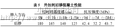 J G- 2 高效減水劑也具有奈系高效減水劑坍落度損失大的特點,為減小坍落度損失,對外加劑采用后摻法作了對比試驗,試驗結果見表5 。