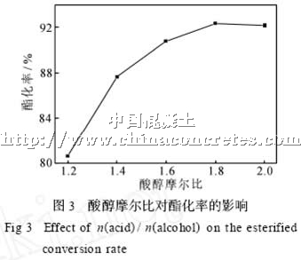 酸醇的比例對酯化率有著重要的影響. 由于甲基丙烯酸本身就是用于合成聚羧酸系高效水泥減水劑的原料, 而聚乙二醇單甲醚在酯化反應結束后作為殘留的雜質極難除去, 所以, 酯化反應都選擇增加甲基丙烯酸的比例以求盡量提高聚乙二醇單甲醚的轉化率, 進而提高聚乙二醇單甲醚的利用率, 減少后處理難度. 為了探討甲基丙烯酸與聚乙二醇單甲醚的物質的量比例與酯化率之間的關系, 筆者在催化劑用量為聚乙二醇單甲醚質量的5 %, 阻聚劑用量為甲基丙烯酸質量的4 % , 反應時間為8 h ,攜水劑量為聚乙二醇單甲醚質量的120 %的條件下, 研究了酸醇摩爾比對酯化率的影響, 其結果如圖3 所示. 由圖3 可以看出, 酯化率隨酸醇摩爾比的增加而增加, 當酸醇摩爾比增至1.8 以上時, 酯化率不再增加. 原因可能是酯化反應為可逆反應,起初增加甲基丙烯酸的濃度有利于平衡向酯化反應方向進行, 但當酸醇比超過1.8 時, 甲基丙烯酸濃度對平衡的影響已不起主要作用, 因而繼續增加甲基丙烯酸酯化率不再提高. 進一步增大甲基丙烯酸的量, 勢必導致酯化產物中有大量甲基丙烯酸殘存, 并且過量的甲基丙烯酸也極易自聚, 直接影響大單體的提純, 同時也影響到下一步減水劑的合成. 故酯化反應酸醇摩爾比應以1.8 為較佳.