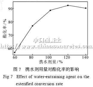 攜水劑可以有效地將酯化反應所生成的水帶出反應體系, 破壞化學平衡而使反應向生成酯的方向移動, 從而達到提高酯化率的目的. 在酸醇摩爾比