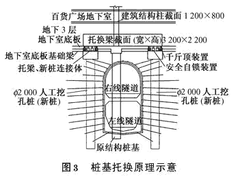 區(qū)間隧道通過百貨廣場(chǎng)、深南東路、華中酒店,由于暗挖隧道位置及其上部建筑物的影響,部分樁在隧道內(nèi)或緊靠隧道,須托換百貨廣場(chǎng)9層裙樓樁6根(樁徑2000mm,樁基持力層均在隧道結(jié)構(gòu)面以下基巖),最大軸力18000kN。
