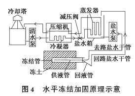在實(shí)際施工中,通過水平鉆進(jìn)凍結(jié)孔,設(shè)置冷凍管,并利用鹽水為熱傳導(dǎo)媒介進(jìn)行凍結(jié)。一般是在工地現(xiàn)場(chǎng)內(nèi)設(shè)置凍結(jié)設(shè)備,冷卻不凍液(一般為鹽水)至-22~-32℃。其主要特點(diǎn)有: