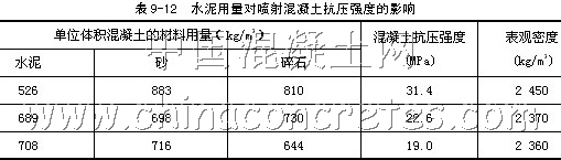 噴射混凝土的膠骨比,水泥與骨料之比通常取 1 ∶ 4 ~ 1 ∶ 4.5 ,水泥過少,回彈量大,初期強(qiáng)度增長慢;水泥過多,不僅產(chǎn)生的粉塵增多,而且混凝土的硬化收縮增大,無論在經(jīng)濟(jì)上或技術(shù)上都是不可取的。噴射工藝特點(diǎn)要求混凝土具有較好的粘附性。水泥含量的較佳值應(yīng)該是保證噴射混凝土具有較高粘附性的同時(shí),避免水泥過多造成浪費(fèi),增加成本。噴射混凝土水泥較佳含量為 300 ~ 350kg/m 3 。當(dāng)水泥用量超過 400kg /m 3 時(shí),混凝土的強(qiáng)度并不隨水泥用量增大而提高,有時(shí)反而會降低。水泥用量對噴射混凝土抗壓強(qiáng)度的影響關(guān)系如表 9-12 所示。