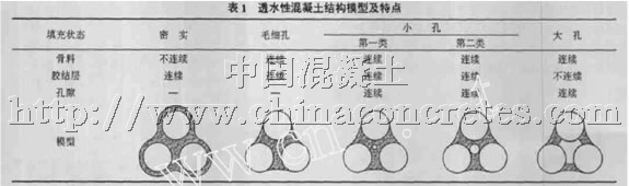 透水性混凝土可以看作由三部分組成,即粗骨料形成的骨架、水泥漿體形成的膠結(jié)層及它們之間的孔隙。按照密實程度的不同,透水性混凝土可以用以下五種模型來表示[6 ] 。如表1 所示,當透水性混凝土處于第二類小孔狀態(tài)時是比較理想的,此時水泥凈漿或加入少量細骨料的砂漿薄層包裹在粗骨料表面,作為骨料之間的膠結(jié)層,形成骨架———孔隙結(jié)構(gòu)。作為骨架的粗骨料和作為膠結(jié)薄層的水泥漿緊密相連,它們之間的孔隙也是連通的,此時的透水性混凝土具有較好的透水性,也可以得到相對較高的強度。當處于密實或毛細孔狀態(tài)時,接近于普通混凝土,具有較高強度,但是沒有形成可以透水的孔隙;當處于第一類小孔狀態(tài)時,雖然形成了孔隙,但是由于孔隙不連通,也不能有很好的透水性;而當處于大孔狀態(tài)時,由于膠結(jié)材料太少且不連續(xù)而不能有較好的強度。