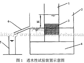 1. 透水方筒套,為邊長100mm 正方形;2. 定位水桶;3. 邊長100mm大孔混凝土;4. 底座,上置定位水桶;5. 量筒;6. 溢水管