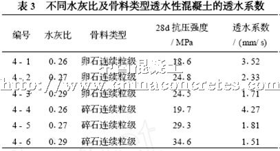 4. 在適宜的水灰比范圍內(nèi),透水性混凝土的透水性隨水灰比增大而減小,采用單一粒徑骨料可以改善混凝土透水性。