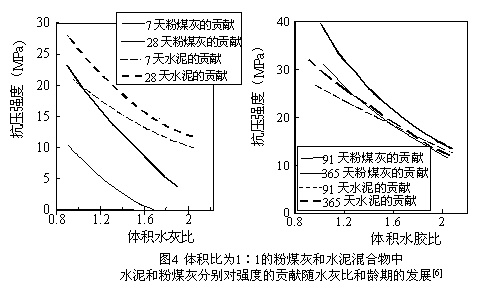其一,關于強度。粉煤灰對混凝土的貢獻對水膠比特別敏感。如圖4[6]所示的粉煤灰摻量為40%的碾壓混凝土中,粉煤灰和水泥分別對混凝土強度的貢獻與水膠比和齡期的關系。在7天,當水膠比.約為0.7(體積比約為1.7)以上時,水泥的貢獻大于粉煤灰的貢獻(粉煤灰的貢獻為0);28天粉煤灰的貢獻雖然增加了,但當水膠比約為0.7(體積比約2.2)時,粉煤灰的貢獻還是為0;而后期,則粉煤灰的貢獻超過了水泥的貢獻。重要的是,可見到無論哪個齡期,粉煤灰的貢獻隨水膠比的降低而增長的速率比水泥的快,也就是說粉煤灰對水膠比更加敏感。如果在較高水膠比下以粉煤灰等量取代水泥,所得到的強度,尤其早期強度當然會下降很多。