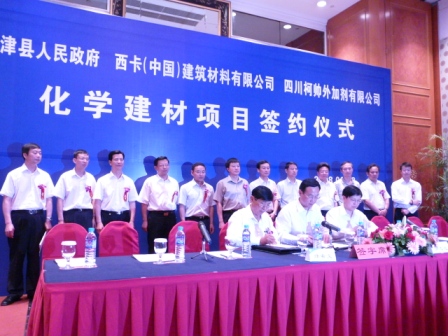 6月3日,新津縣政府與世界精細化工巨頭——瑞士西卡公司、國內同行業領軍企業——四川柯帥外加劑有限公司正式簽約。西卡公司與四川柯帥外加劑有限公司將在新津修建占地70畝的建筑用化學材料產品基地,這將為四川及周邊地區的災后重建、加快發展起到積極作用。市委副書記唐川平出席了簽約儀式。