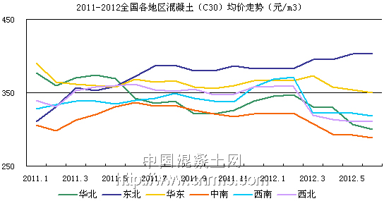 我國混凝土市場的發展依賴于基建投資的推動,房地產開發、保障房建設、鐵路基建以及重大工程項目都是推動混凝土市場發展的驅動力。據發改委公布的數據顯示,2012年1-6月份,全國房地產開發投資30610億元,同比名義增長16.6%(扣除價格因素實際增長14.3%),增速同比回落16.3個百分點,這是繼去年7月份以來連續10個月累計同比增速出現下滑。今年上半年的單月數據中,除5月單月房地產投資額同比增長18.2%,較4月的9.2%的增速上漲9個百分點,其余月份同比增長速度較前一個月均出現回落。受國家限購政策的持續不放松,樓市購買力也大幅度的縮減,絕大多數城市的成交量均處于歷史低位,房市的持續下行對混凝土市場產生了不小的影響,不少建筑企業放緩了工程進度,對混凝土的需求大幅下滑,市場供大于求,造成了混凝土市場價格的一路下行。
