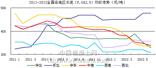 華東及中南地區是水泥價格下跌的“重災區”,其中華東地區P.O42.5水泥從2011年1月至2012年6月價格已下跌了144元/噸,跌幅達30%,杭州、湖州等地已宣布停窯限產,以緩解高庫位壓力。而進入6月份以來,江浙一帶受梅雨季節影響,浙江停窯10天,蘇南地區所有企業一半產能停30天。