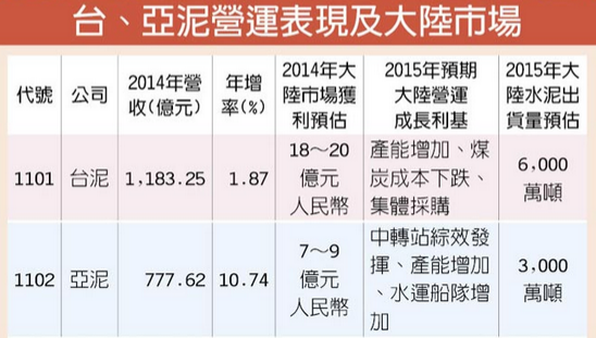 依臺、亞泥今年對大陸市場的產(chǎn)能預(yù)估,臺泥會從去年的5,500萬噸,增加到6千萬噸;亞泥因去年購并四川蘭豐水泥的效益發(fā)揮,今年的產(chǎn)能也會從2,500萬噸,提升到3,000萬噸。
