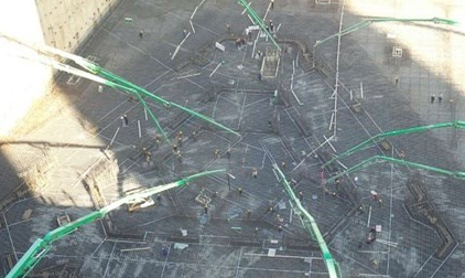 “大體積混凝土無線溫度監控系統”是基于物聯網技術和無線傳輸技術,集設備遠程控制、溫度實時采集、數據無線傳輸、云端數據實時處理及顯示等功能于一體的第四代大體積混凝土溫度監控系統。與傳統的溫度監控系統相比,該系統具有現場布線少、現場維護工作量小、數據實時性強、監控節點成活率高、人工干預少等優點。經監控效果驗證,數據基本可以保證100%完整性。大連綠地中心大底板混凝土澆筑方量達2.5萬立方米,核心筒區域底板厚度為4.5米,局部厚度為7.5米。現場共計布置測溫軸14個,溫度傳感器100個,使用無線溫度監測設備四通道節點7個,遠程通訊節點1個。