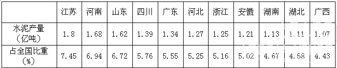 (一)全球及我國水泥產業概況。目前,全球水泥生產能力約為48.8億噸,主要集中在中國、西歐、南亞、中東、非洲和東南亞。2012年,全球水泥產 量36億噸,其中中國占全球總產量的60%以上。2013年全國完成水泥24億噸,有11個省份的水泥產量超過1億噸。