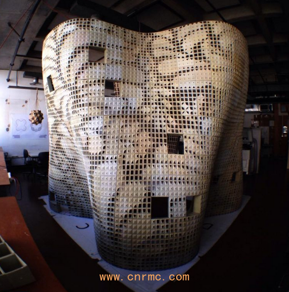 Enrico Dini 是英國(guó) Monolite UK Ltd. 公司老闆,同時(shí)也是一名發(fā)明家。他研發(fā)的「D Shape」的大型3D打印機(jī),它能在6米x6米的平面上作業(yè),高度可升高至9米甚至12米,做立體的活動(dòng),其底部有三百個(gè)伺服噴嘴,噴嘴間距為20mm。這種3D打印機(jī)建造建筑物的速度是普通建筑方法的4倍,并且能減少一半成本。下面是用這個(gè)大型打印機(jī)打印出來(lái)的亭子,亭子是建筑師 Andrea Morgante 依照一種微生物「Radiolaria 放射蟲(chóng)」所設(shè)計(jì)的形體,由 D-Shape 打印而成。
